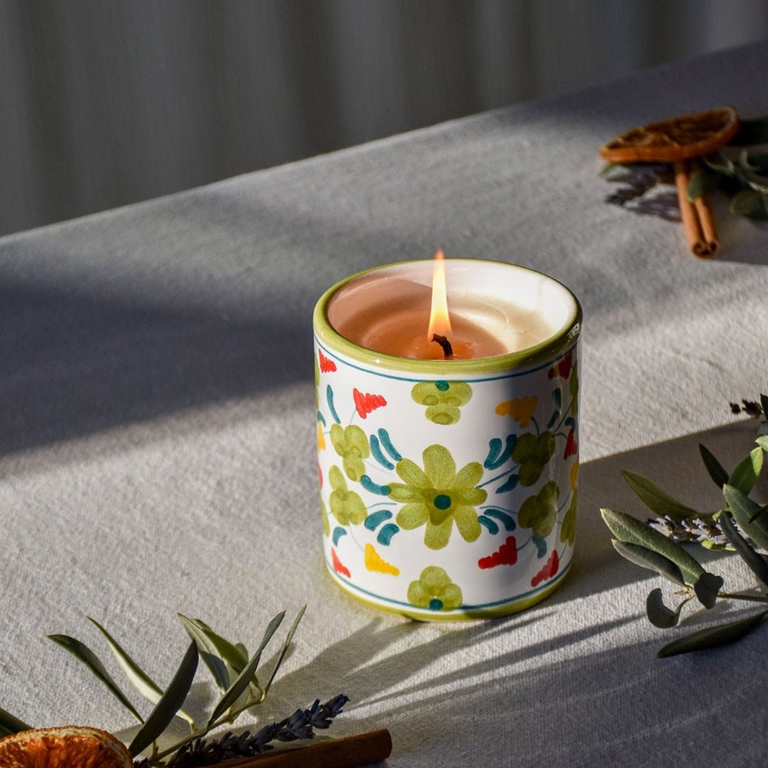 Chaque pièce de céramique est peinte à la main dans un atelier familial au cœur de l’Ombrie et au savoir-faire centenaire, pour être ensuite coulée en France avec une cire 100% végétale à base de soja et aux parfums de Grasse.